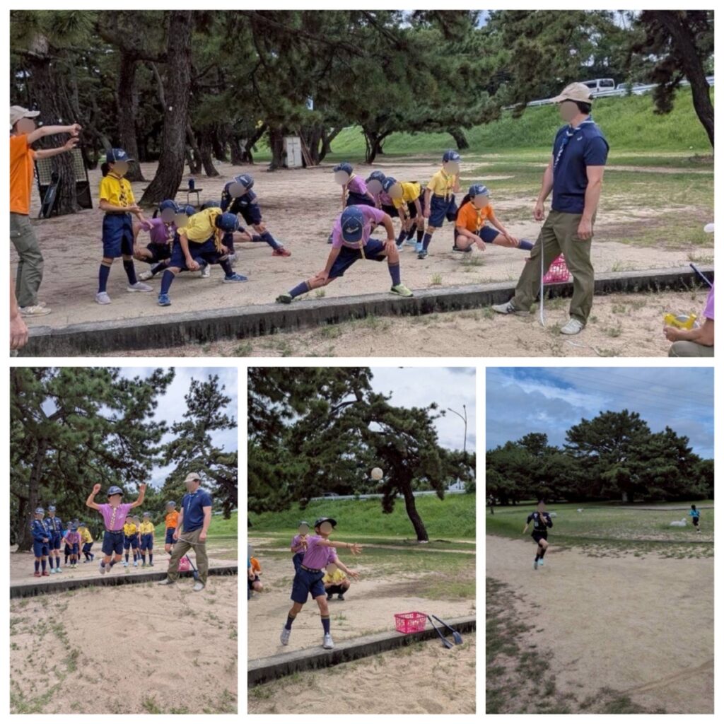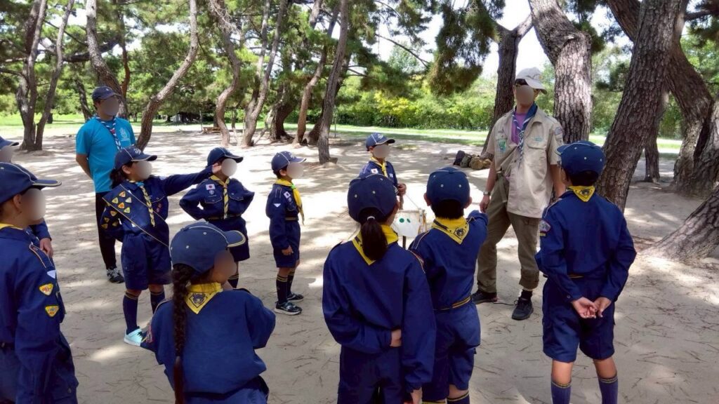 次に、集合・解散・報告の基本動作や、カブスカウトの敬礼・握手・祝声の練習を行いました。