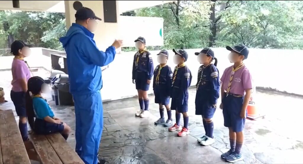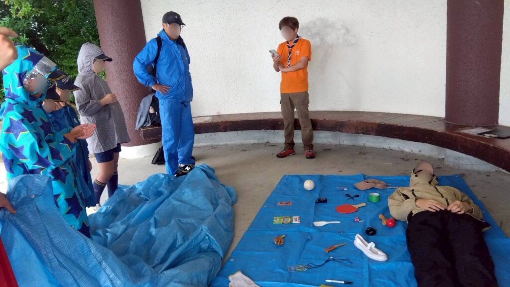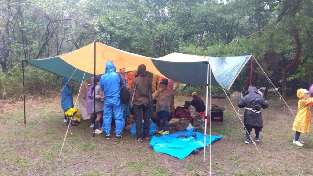 雨が降ってきたため、ボーイ隊が張ったタープの中に荷物を置かせてもらいました。