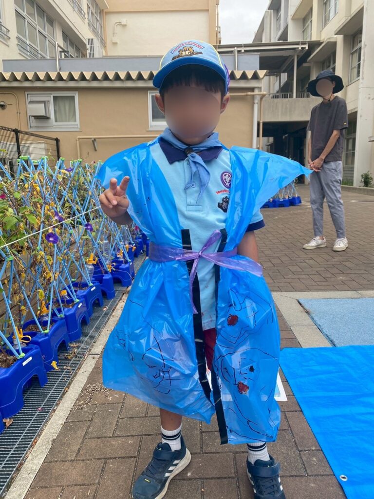 大きなカラーポリ袋をハサミでカットしたら、色とりどりのビニールテープやマジックを使って、世界に一つだけの法被をデザインしていきます🎵