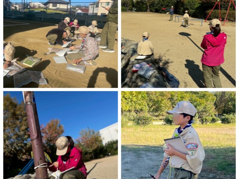 今日は、最高の秋晴れの中、街中ハイクを行いました。 ポイント作業は、GB会議で希望が出た、スカウト技能の習得を中心に行いました。読図に必要な地図記号、水準点確認、クロスベアリング、野帳の取り方、略地図 …